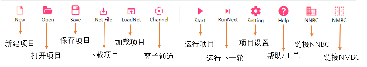 ## 基本概念介绍 - **Neuron** :神经元,也即神经细胞,是神经系统最基本的结构和功能单位。 - **Compartment**:树突,一个神经元可以有多个树突,树突之下还可以添加树突分支。 - **Connection**:连接,神经元间的连接。 - **Receptor**:感受器 - **Channel**:离子通道,一个神经元可以包含多个离子通道。 ## 核心功能简介 - 创建、运行、暂停神经网络 - 支持实时渲染神经网络运行状态 - 内置80余种的离子通道,支持添加、修改自定义神经元离子通道 - 支持下载、上传网络项目文件,便于用户之间共享项目 - 支持实时绘制选择的神经元的Spike信息 ## 界面介绍  如上图,平台操作界面主要分为以下几个模块 + **菜单工具条**:这里可以打开、保存文件,获得帮助。  + **结构窗口**:对神经元的添加、离子通道的添加等结构修改都在这里进行。结构窗口上的工具栏功能具体如下图:  + **属性窗口**:对各元素(元素的选择通过结构窗口)的属性设置在这里进行。 + **神经元及神经环路显示窗口**:显示神经元和神经环路,且可以与结构窗口交互使用。 + **神经活动窗口**:神经脉冲序列、突触电导变化、刺激电流、钙离子浓度等信号的展示。 ## 创建一个NBC项目 ### 新建一个NBC项目 点击菜单栏中的【New】按钮,在弹出的窗口中填写表单。  + **Project Name** 项目名称 + **Project Description** 项目描述 创建项目完成后将自动弹出神经元库窗口,如下图:  上图左侧是神经元列表,右侧是神经元的预览图。 + **Public** 公共神经元库,包含几十个不同脑区的单房室或多房室的神经元模型,所有用户均可以使用这些神经元模型 + **Private** 私有神经元库,新创建的神经元或从项目中导出的神经元均会保存在私有神经元库中 + **Local** 本地神经元库,该功能一般配合本地版的软件使用。 您可以选中一个神经元后单击【Add】按钮添加至项目,也可以直接关闭该界面后创建新的神经元。 ### 新建一个Neuron 真实大脑中的神经元并不是一个点,而是有着复杂的形态,也就是说,在一个神经元上就可以进行复杂的树突计算,因此,对神经元形态的模拟非常重要。NBC-NB支持多房室神经元的模拟,在构建多房室神经元的过程中,首先点击平台主界面左侧工具栏中【+】按钮,系统弹出“Add Neuron”界面,如下图所示。   输入Neuron Name后单击【OK】即可创建一个单胞体的神经元。 ### 新建一个房室(树突) 在结构窗格中选中一个Neuron的房室,如下图:  单击添加房室按钮弹出新房室的配置窗口如下图:   表单参数说明如下: + **Name** 房室名称,在当前Neuron中不可重复 + **Length** 长度 + **Radius** 半径 + **Color** 颜色,单击颜色按钮可以打开颜色选择界面。 ### 导入一个Neuron 单击导航窗格中的导入按钮,弹出神经元列表如下图:   选中某一个神经元后,单击【Add】按钮添加至项目中。 经过上述步骤以后创建的项目渲染图类似下图:  ### 创建连接(突触) 选中某一个房室,如下图  单击结构窗格中的创建连接,弹出创建连接的窗口如下图:   其中: + **Pre-Soma** + **Pre-Synaptic** 突触类型 + **Receptors** 接收器类型 创建连接完成之后的项目渲染图类似下图:  如上图,六边形节点代表连接为AMPA或GABA受体,如果四边形,则代表该连接有NMDA受体。 ### 运行网络 单击菜单栏中的【Start】即可开始运行当前的网络。 网络运行的结果类似下图:  在上图中可以看到神经元每个房室的活动状态。单击SpikeTrain界面上的设置按钮,在弹出的窗口中如下图:  在上图中选中或者取消显示某些线条,在SpikeTrain中将会显示或隐藏相应的线条。 如要修改线条的颜色可以单击左侧结构窗口上的LocalSetting,如下图:  弹出的设置窗口如下图:  在上图所示的窗口中可以对相应的线条颜色进行修改,同时也可以设置某些线条在纵向上的缩放程度,这对观察某些变化较小或较大的线条会很有用。 单击菜单栏中的【RunNext】可以继续运行下一个Runcourse ### 删除连接、离子通道、房室、神经元 在本平台中删除按钮位于左侧工具栏当中,如下图:  该删除按钮可以用来删除项目中的连接、房室、离子通道、神经元,具体删除哪一个元素,取决于左侧神经网络结构图中选中的是哪一个元素。如果左侧选中的是连接,则删除功能将删除选中的连接;如果选中的是离子通道,则删除离子通道;如果选中的是房室,则删除选中的房室;同理,神经元也是如此。 可以通过神经环路显示窗口中直接单击连接进行选中,也可以在左侧神经网络树形结构中通过【神经元】-->【树突】-->【Synaptic Inputs】-->【神经元名称】的方式进行选中。 ## 相关属性介绍 ### 项目相关属性说明 #### 项目属性 LabSetting + **RunCourse** 单次运行时长 #### 本地设置 LocalSetting LocalSetting中包含了一些自定义的设置。例如可以自行设置电压信息、钙离子浓度的线条绘制颜色以及纵向缩放参数。所设置的信息将保存在本地。 + **CompartmentSetting** 房室设置 + **Potential** 电压信息 + **Ca** 钙离子浓度 + **STC_Ca_d** + **Stimulator** 刺激信号 + **ScaleY** 纵向缩放参数 + **SynapseSetting** 突触连接设置 + **NTReleasableRate** + **Conductance** 电导 ### Neuron 相关属性 + **UID** 唯一ID + **Name** 名称 + **Geometry Mode** 是否采用几何形态定义多房室神经元 + **Axial Resistivity** 多房室模型中的Ra + **Compartmental Conductances** (仅用于多房室神经元模型) #### 房室相关属性 + **Biophysical Properties** 房室的生理属性 + **Capaci