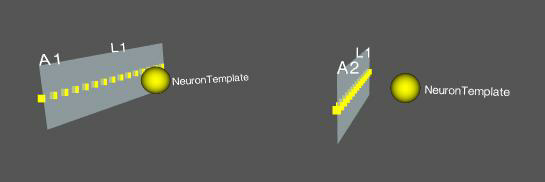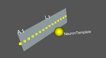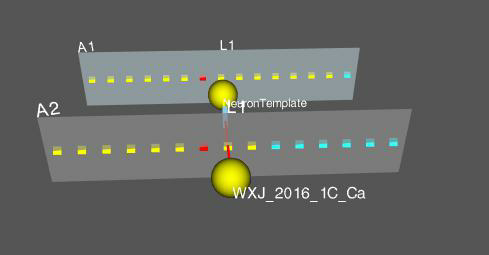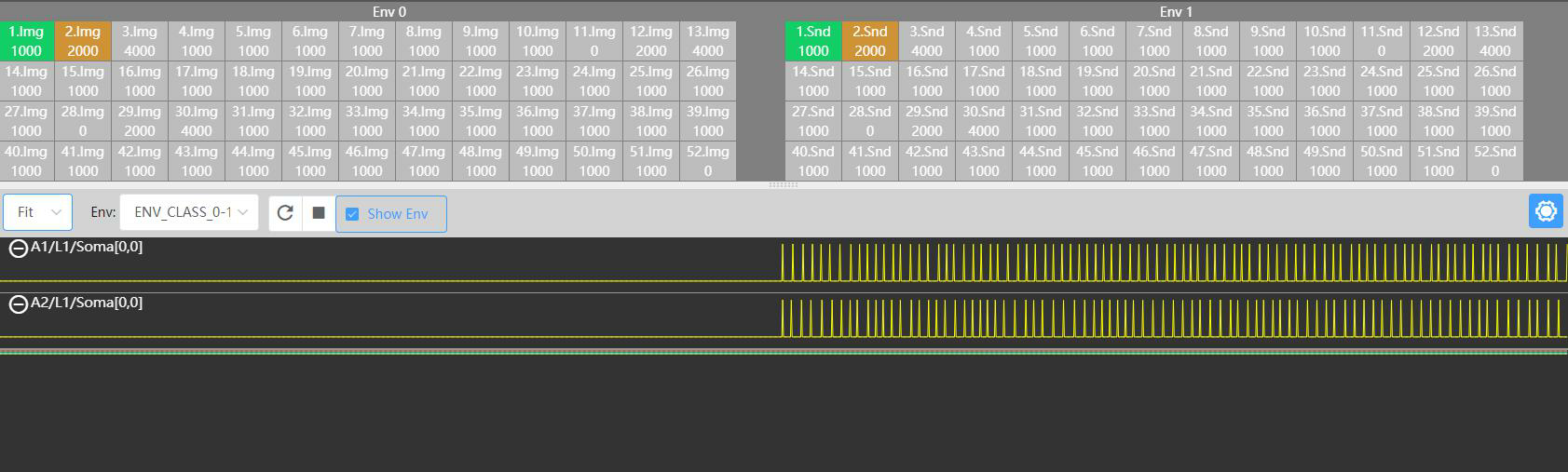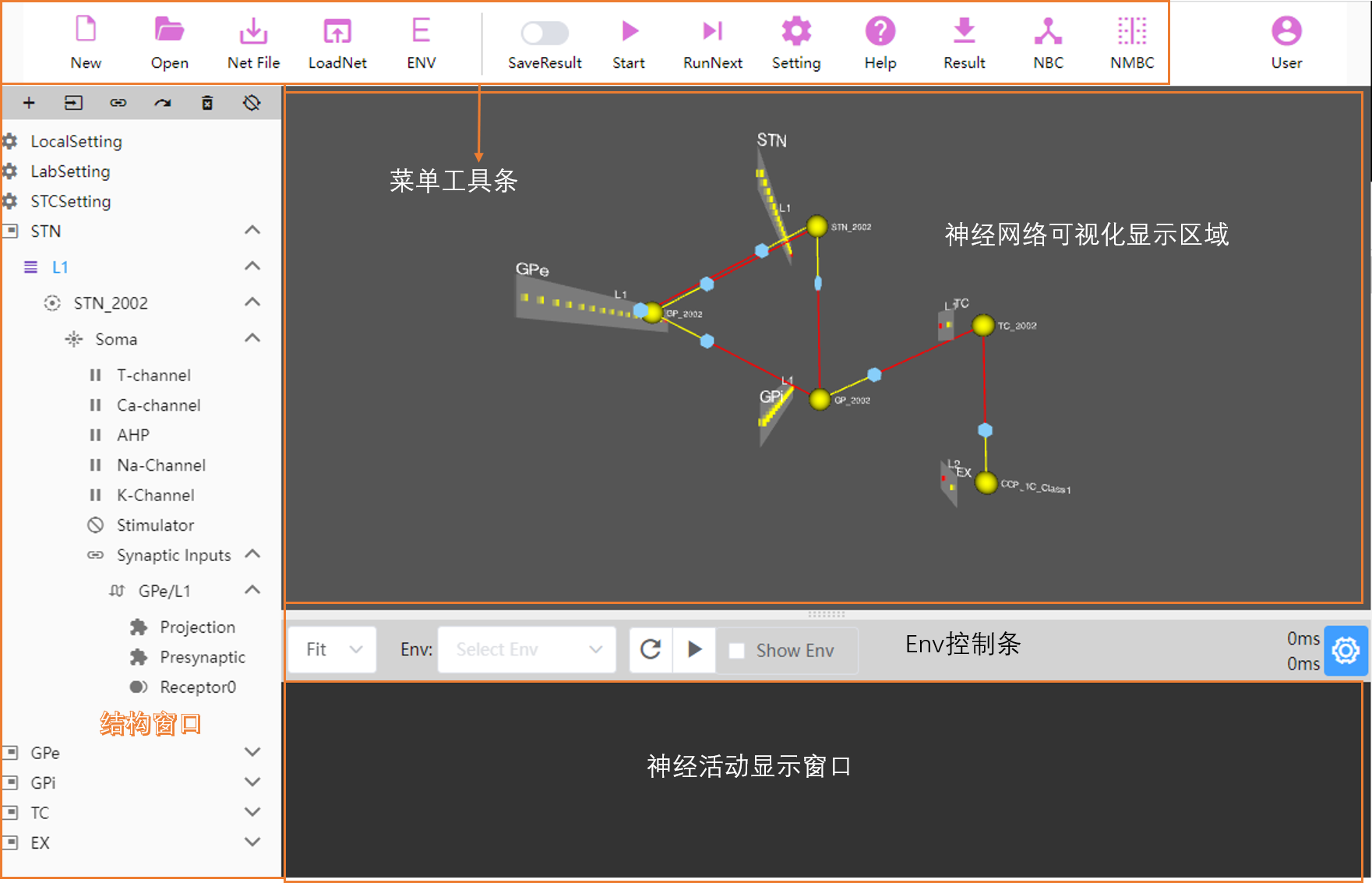 ## 1. NeuNetBuilderCloud(NNBC) 简介 NeuNetBuilder(NNB)是中小规模脉冲神经网络的构建和分析软件,由中国传媒大学脑科学与智能媒体研究院研发和维护。NNB以层为神经网络的构建单位,每层可包含多个神经元。目前NNB支持多房室神经元模型和STC突触可塑性模型。任何建议意见欢迎通过网页和我们联系。 NNB的主界面由以下几个个主要区构成,如下图:  + **菜单工具条**:这里可以打开、保存文件,获得帮助。  + **结构窗口**:对神经元的添加、离子通道的添加等结构修改都在这里进行。其中工具栏的主要功能如下:  + **属性窗口**:对各元素(元素的选择通过Structure Window)的属性设置在这里进行。 + **神经网络可视化显示窗口**:显示网络结构及网络中的神经元,且可以与结构窗口交互使用。 + **神经活动窗口**:神经脉冲序列、突触电导变化、刺激电流、钙离子浓度等信号的展示。 + **Env控制栏** 包含Env的选取、显示、刷新等功能。如下图:  ## 2. 相关概念介绍 + **感知层** 用于感知Env中所产生的的刺激信号,仅支持单房室神经元 + **非感知层** 不受Env的影响,但可以接收感知层传递的信号,也可以自发产生信号,这取决于非感知层中添加的神经元类型。非感知层中支持单房室、多房室神经元。 + **选中/取消选中神经元** 可以将鼠标移至神经元上,当出现蓝色半透明小球时,双击鼠标即可实现选中/取消选中神经元。选中的神经元将变为红色。 + **查看神经元映射** 可以将鼠标移至Pre-Layer的神经元上,当出现蓝色半透明小球时,右键单击鼠标可以查看当前神经元与Post层的神经元的映射关系。显示映射关系的神经元将显示为亮蓝色。 备注:同一层中仅支持添加一种神经元。 ## 3. 创建/打开项目 ### 3.1 新建项目 点击菜单工具条上的【New】按钮,在弹出的界面中填写项目名称和项目描述后单击【Create】按钮创建。如下图:  ### 3.2 创建层 点击软件主界面左侧工具栏【+】按钮,系统弹出**Add Layer**界面如下图。   + **Area Name** : 区域名称。神经元层所在的区域。每个区域内可以包含多个层 + **Layer Name** : 层名称。 + **Layer Size Grid X** : 层的宽度 + **Layer Size Grid Y** : 层的高度 + **Sensor Layer** : 当前层是否为感知层。默认为非感知层。 + **Env** : 感知类型。如果为感知层,需要设置感知层的感知类型。目前感知类型仅支持两种Env0和Env1 如上图的参数,将自动创建 区域【A1】,并在【A1】中创建感知层【L1】,并将【L1】的感知类型设置为了Env0. ### 3.3 为层添加神经元 首先在左侧的结构窗口中选中要添加神经元的层,例如【L1】。单击工具条中的【导入】按钮 弹出神经元的选择列表如下图。   + **Public** 公共的神经元库 + **Private** 私有的神经元库。若要在此处添加个人的神经元可以通过 【Local Neuron List】或者 [NBC](https://nimibrain.cuc.edu.cn/nbcloud/) + **Local** 本地神经元库。需要加载本地神经元XML文件后才能显示列表。通过该列表可以将本地的神经元库上传至云端。 + **Neuron Number** 神经元的数量 + **Distribution** 是否将神经元均匀分布在层当中。默认为均匀分布。该属性可能会影响到后面突触连接的映射关系。 + **Number of rows** 每行的神经元数量,在采用均匀分布时有效。 在左侧的神经元列表中选中神经元后,右侧的Preview窗口中将会渲染出神经元模型的结构。 备注:在为感知层添加神经元的时候无需选择神经元,系统会为其添加默认的单房室神经元。如上图,我们将为作为感知层的【A1/L1】添加15个神经元,并采用均匀分布的方式,将神经元均匀分布在一行上。 添加完成后,神经网络显示窗口的显示如下图:  可以按照以上方法再添加一个感知类型为Env1的感知层后,神经网络显示窗口效果如下:  如此,我们在网络中添加了两个感知层。此处需要注意的是,**一个项目中最多可以添加两个感知层,并且两个感知层的感知类型需要是不同的**。 ### 3.4 神经元电活动的仿真实验 #### 3.4.1 感知层的电活动——环境刺激 在NNB中,我们设计了环境刺激作为感知层的刺激(在NNBC中,感知层无法接收来自其它层的突触输入),模拟真实生物大脑接收环境中视觉、听觉、触觉等一系列感觉刺激的过程。目前,NNBC的环境刺激文件支持两个环境(如视觉和听觉),环境刺激文件的格式是xml,定义了每个时刻每个感知层神经元的放电率,感知层神经元接收到放电率的数值后,即产生服从泊松分布的spike train。 点击菜单栏中的【ENV】按钮,系统弹出**Multi Env Control**界面如下:  + **Public** Env公共列表 + **Private** 私有的Env列表 + **Env Name** Env名称 + **ExpProc Name** 当前实验的名称 + **ExpStep** 实验的次数 + **Env0/Env1** Env类型,**需要与感知层的感知Env类型相对应**。 + **Background** Env背景刺激强度(暂不支持) + **Scale** 刺激幅度 + **Type** 刺激类型 + **Duration** 刺激的持续时间 + **Del Env** 删除选中的Env + **Upload Env** 上传Env + **Download Env** 下载Env,下载后可以将此Env文件分享给其他人使用 + **Name** 刺激的名称 + **Class** 刺激所属类别 + **FilePath** 文件路径(暂未启用) + **Features** 每个神经元的放电率,其中包含的值的数量与Features Length 一致。每个神经元的放电率以“;”隔开。每个神经元的放电率的取值范围为[0,1] + **Features Length** 覆盖的神经元数量。**这个参数要尽可能的与感知层的神经元数量保持一致** 备注:当选中Env 刺激列表中的条目后,右侧才会出现刺